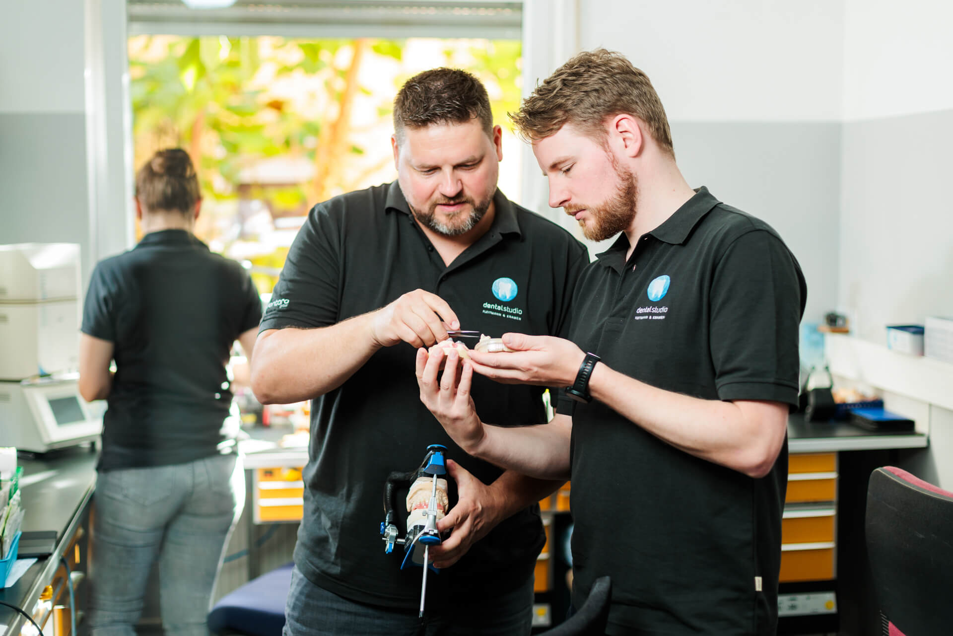 Ein eingespieltes Team aus Meistern, Technikern und Verwaltungskräften steht Ihnen für eine sichere und kompetente Beratung zur Seite. Geschäftsführer und Zahntechnikermeister Markus Kramen sowie die Zahntechnikermeister:innen Christian Adel und Hanna Niedereichholz garantieren höchste Fachkompetenz.